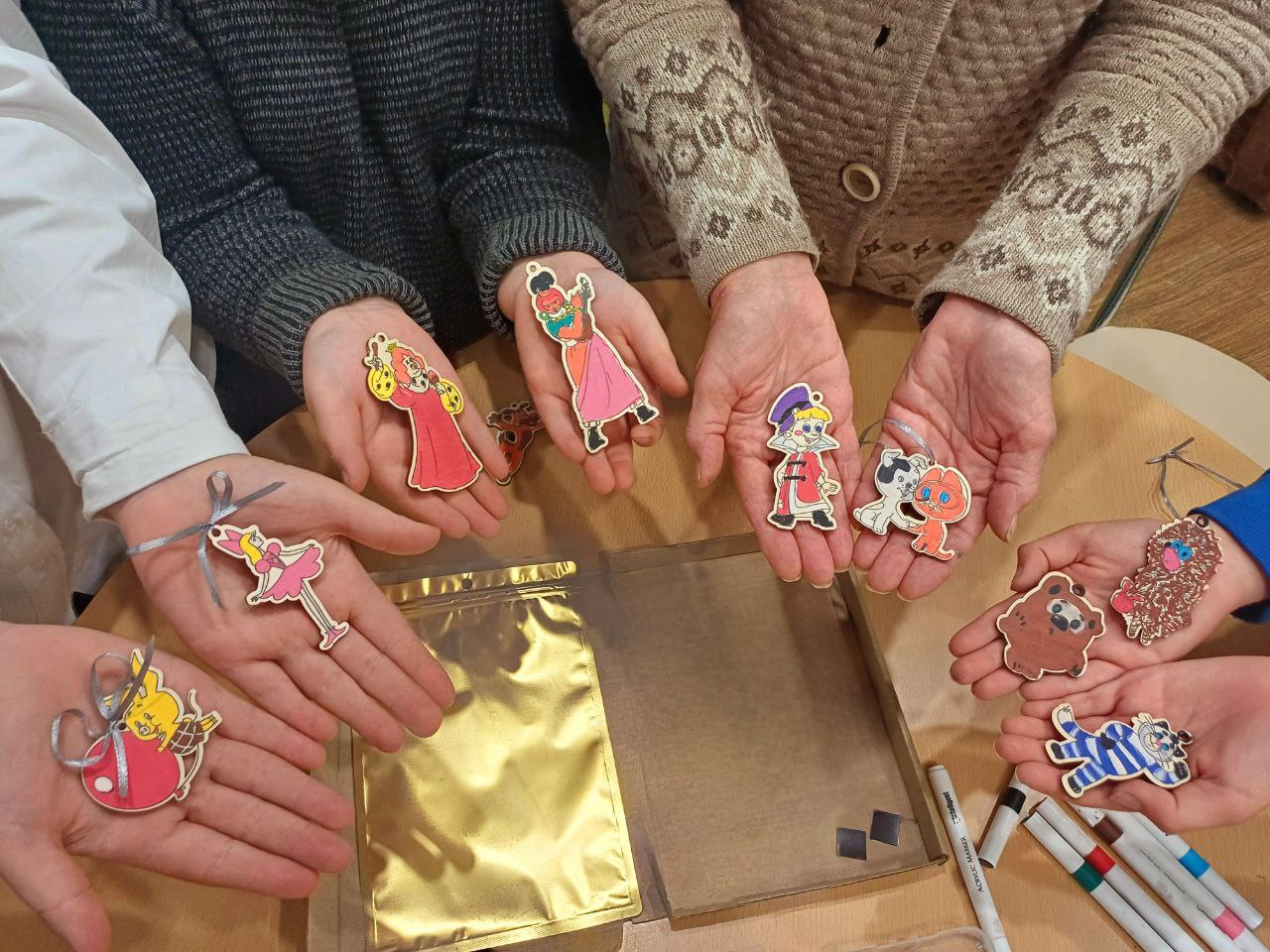 На занятии с детьми был проведён творческий мастер-класс по изготовлению деревянных магнитов "Персонажи сказок и мультфильмов" и их росписи акриловыми красками и фломастерами.
